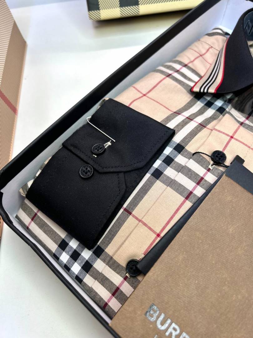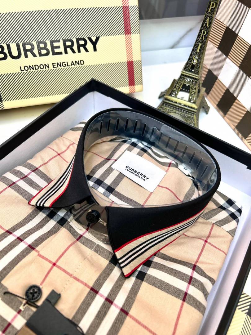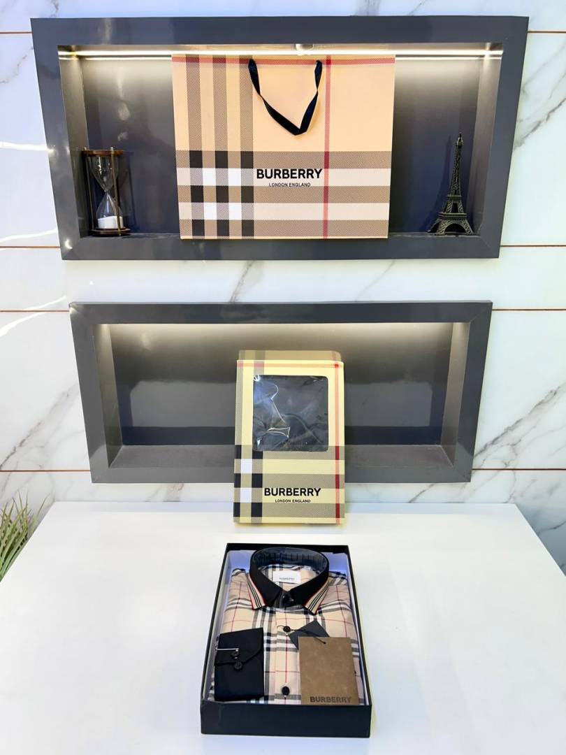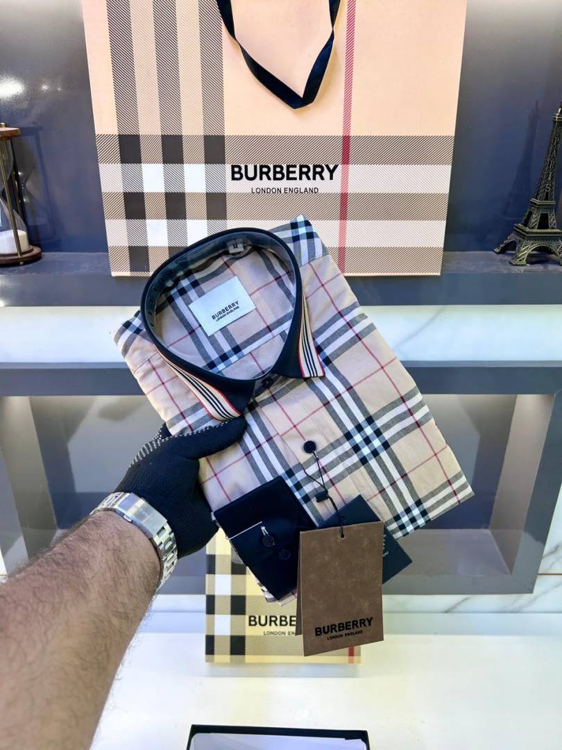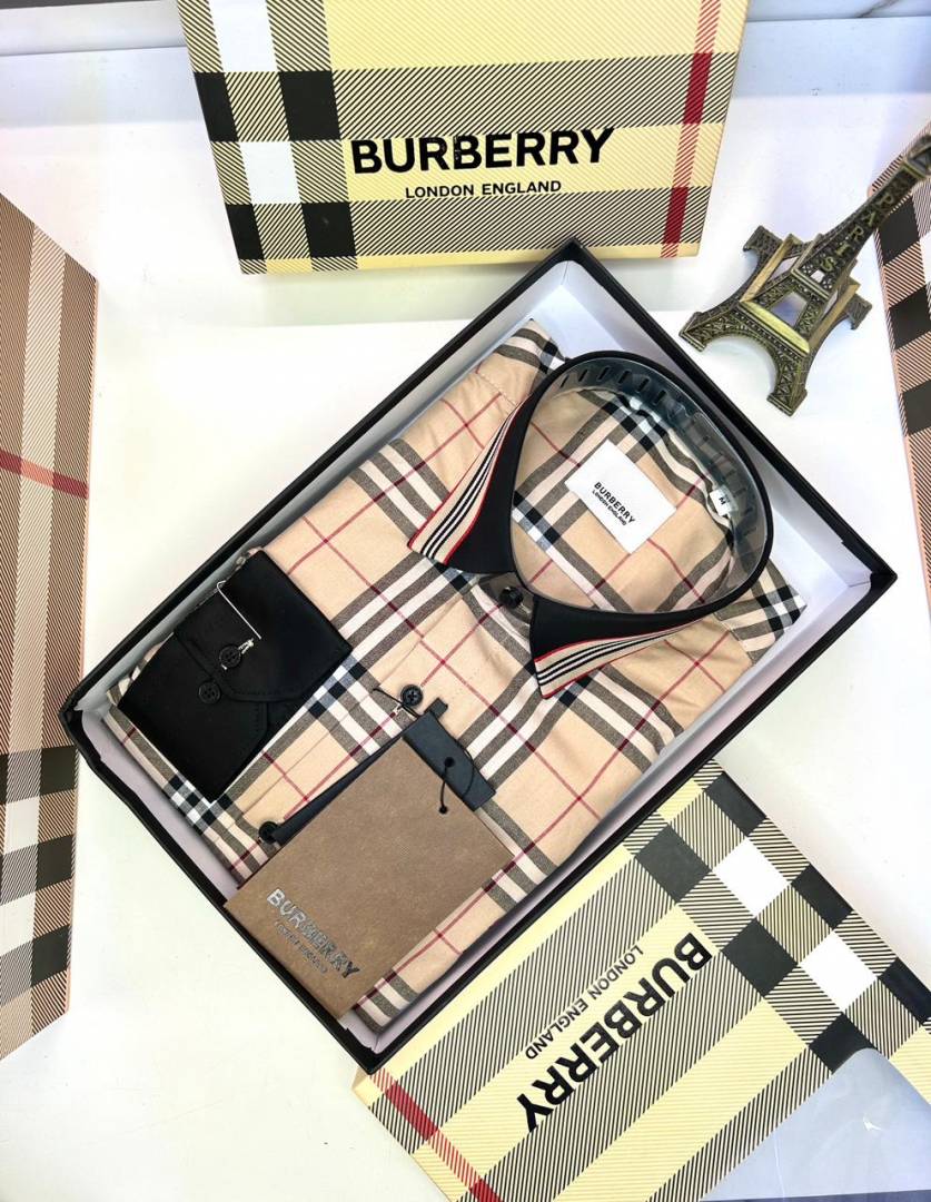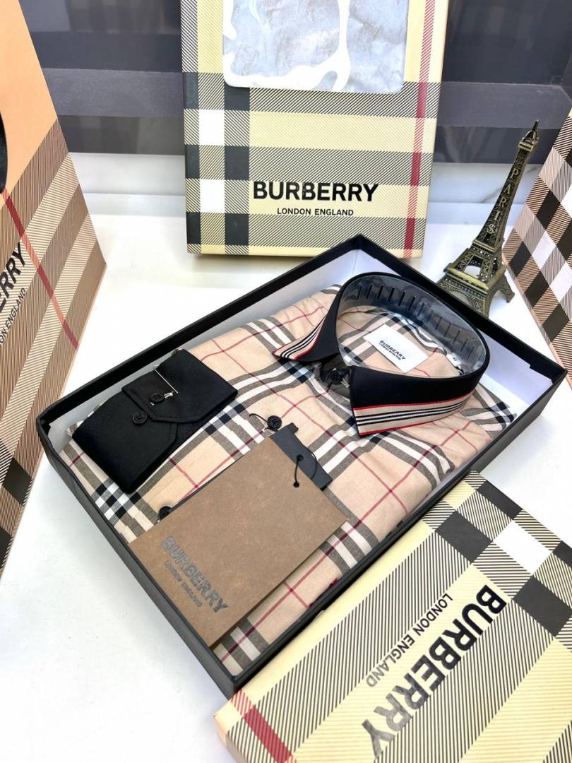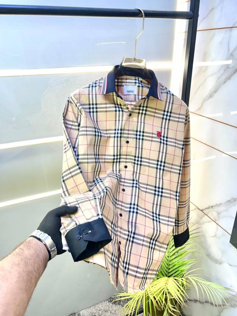 Burberr y Checks Embroidery Logo Beige Premium Shirt With Brand Box Packing And Carry Bag F3542-BE